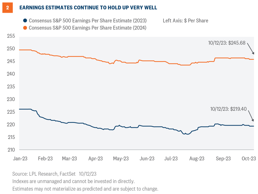 Analysts have underestimated corporate America’s ability to generate revenue and control costs throughout 2023, while economists have generally underestimated the resilience of the U.S. economy, consumers’ willingness to spend, and benefits from both prior stimulus and previously low interest rates. As a result, even under intense cost pressures, companies have exceeded expectations throughout the year and kept estimates steady (Figure 2). Remember, consensus earnings estimates for a given year have historically started off about 10% too high, on average.