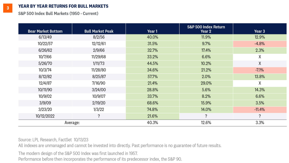We would be remiss if we didn’t mention the current bull market turned one last week, on October 12, 2023. Year one of the current bull has been unspectacular with a gain of 21.6% (excluding dividends), compared to the historical average of around 40% (Figure 3). The tepid rebound off bear market lows has been partly due to the shallow bear market in 2022 and atypically high valuations at that time. The P/E on a next 12 months basis was over 15 at the October 2022 lows, in line with long-term averages rather than a recession-like discount, which left less upside in a rebound. Sticky inflation and sharply higher interest rates certainly also played roles in slowing this bull.