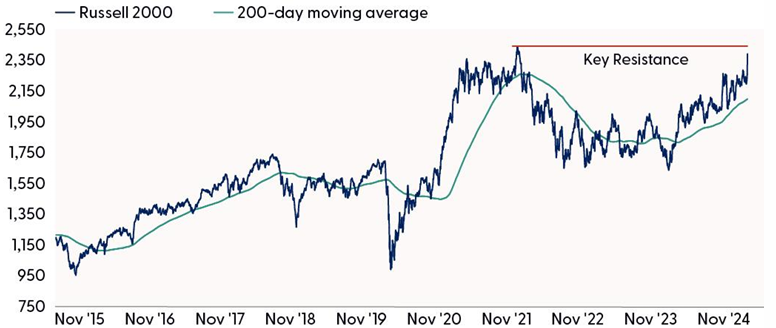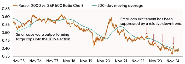At the risk of throwing some rain on the post-election parade, we believe the enthusiasm for small cap stocks may be getting somewhat overdone for two primary reasons. First, one key element of the small cap trade is lower taxes under Trump 2.0. But given the federal budget situation, when the horse-trading begins next year in Washington, D.C., we expect some pressure from centrists and deficit hawks, even under a Republican sweep of Congress (likely, but not assured as votes are still being counted), to keep the corporate rate where it is at 21%. Efforts to provide tax incentives for domestic production could work, but the effects could be minimal. And that’s putting aside the fact that the expiration of the Tax Cuts and Jobs Act of 2017 is still more than a year away.