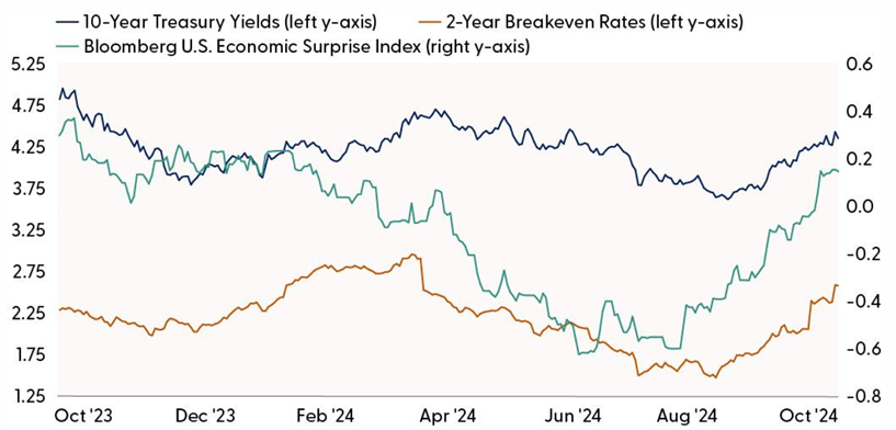Another reason yields have moved higher is that the bond market isn’t fully convinced the inflation genie is back in the bottle. The risk for the bond market is a Fed that cuts too aggressively into a still-growing economy, which would then potentially rekindle inflation concerns. Moreover, as it relates to the Trump presidency, there is a concern that deficit spending (which would have likely happened under a Harris presidency as well) and tariffs could help growth but also keep inflationary pressures elevated. Of that recent move higher in the 10-year Treasury yield, roughly 40% of the move can be attributed to inflation concerns.