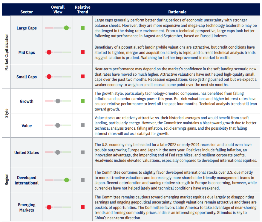 The STAAC maintains its recommended neutral equities allocation based on the Committee’s assessment that the risk-reward trade-off between equities and fixed income is roughly balanced. Stock valuations are not attractive at such high yield levels in the bond market. The Committee favors large cap stocks over their smaller brethren due to potentially slower economic growth and tighter credit conditions, though valuations remain attractive for high-quality small caps. Technical analysis points to growth over value, but valuations remain elevated for growth stocks broadly. The Committee continues to slightly favor developed international stocks over U.S. due mostly to valuations and increasingly more shareholder friendly management teams in Japan, but currencies have not been helping and Europe has clearly weakened. Key risks to equities include overtightening by the Fed, broader military conflict in Europe, and escalation in U.S-China tensions.